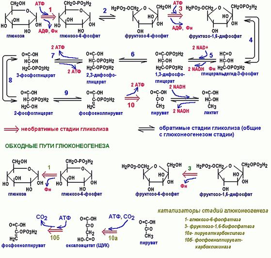 !!! Однако, три реакции гликолиза (1, 3 и 10) необратимы, и в обход этих реакций в глюконеогенезе протекают другие реакции, катализируемые соответствующими ферментами.