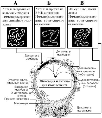 Накопление антител против антигенов базальной мембраны клубочка (БМК), реагирующих с эпитопами на молекулах коллагена IV типа, приводит к фиксации и активации комплемента (рис. 1), при этом при иммунофлюоресценции определяется линейное накопление иммуноглобулинов и комплемента в базальной мембране. Линейное накопление антител связано с тем, что антигенные эпитопы являются частью повторяющихся субъединиц, которые равномерно расположены на базальной мембране. В тех случаях, когда организм начинает вырабатывать IgG против антигенных гликопротеинов базальной мембраны клубочков, возникает противомембранная болезнь. Эти изменение приводят к развитию ярко выраженного пролиферативного гломерулонефрита с кровоизлияниями.