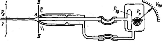 Поток не может протекать через внутреннюю трубку, так как она с другого конца подсоединена к измерительному элементу. Следовательно, точка на конце ПВД— критическая точка, в которой струйка при обтекании ПВД разветвляется, и скорость в этой точке равна нулю.