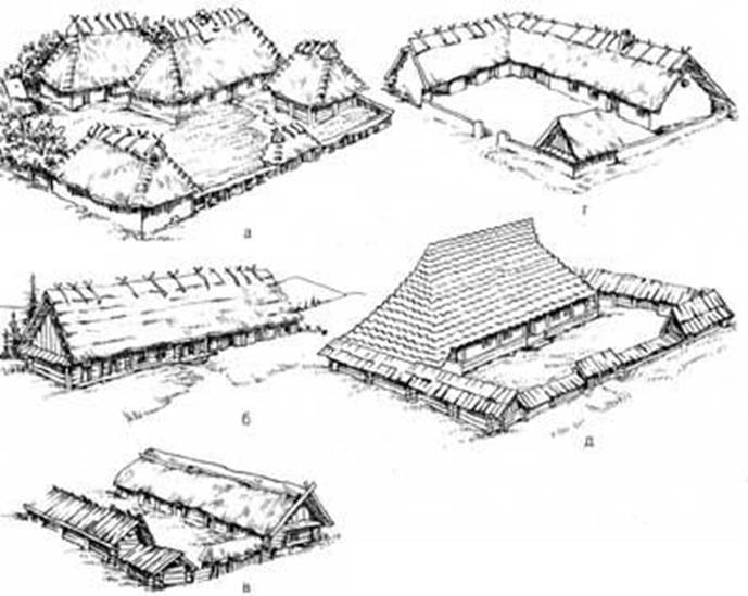 Срубные – стены с горизонтально выложенными колодами, бревнами, соединенными на углах. Каждый ряд называется «венцом». Длина срубов достигала 5 м.
