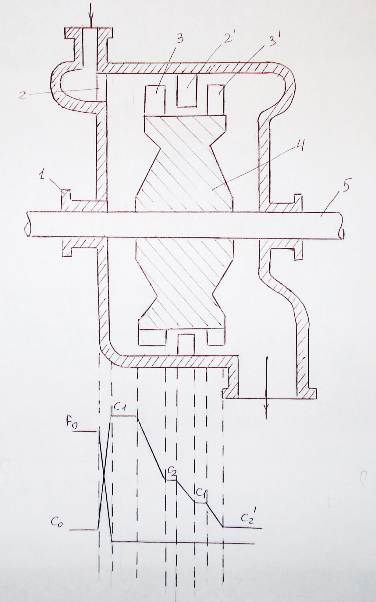 Пар от начального давления Р0 до конечного Р1 расширяется в соплах 2, а на лопатках как и в одноступенчатой турбине, происходит преобразование кинетической энергии движущейся среды пара в механическую работу на валу 5 турбины. На диске 4 закреплены два ряда рабочих лопаток 3 и 3’, разделенных неподвижными направляющими лопатками 2’, которые крепятся к корпусу турбины 1. В первом ряду рабочих лопаток скорость пара изменяется лишь частично от С1 до С2, после первого ряда рабочих лопаток 3 пар поступает на неподвижные лопатки 2’, где изменяется направление его движения.