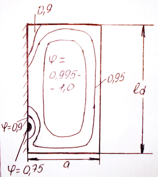 Из рисунка следует, что в ядре потока потери почти отсутствуют и трение имеет место лишь в пограничном слое. В углах соплового канала на спинке профиля значения коэффициентов φ минимальны. Это объясняется наличием в этих местах вихрей.