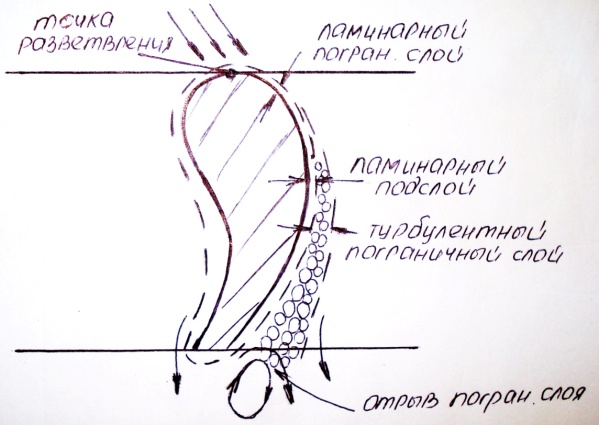 Структура пограничного слоя при обтекании лопатки вязкой жидкостью показана на следующем рисунке.