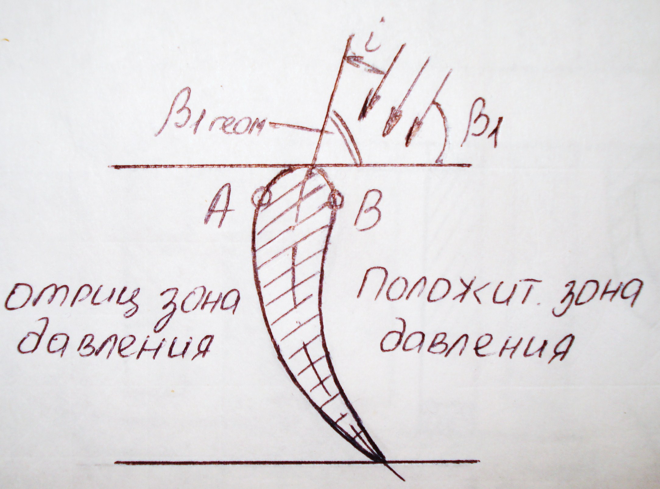 ) происходит понижение давления на вогнутой стороне профиля вблизи входной кромки (точка В), что может вызвать местный срыв потока и послужит причиной повышения лобового сопротивления.