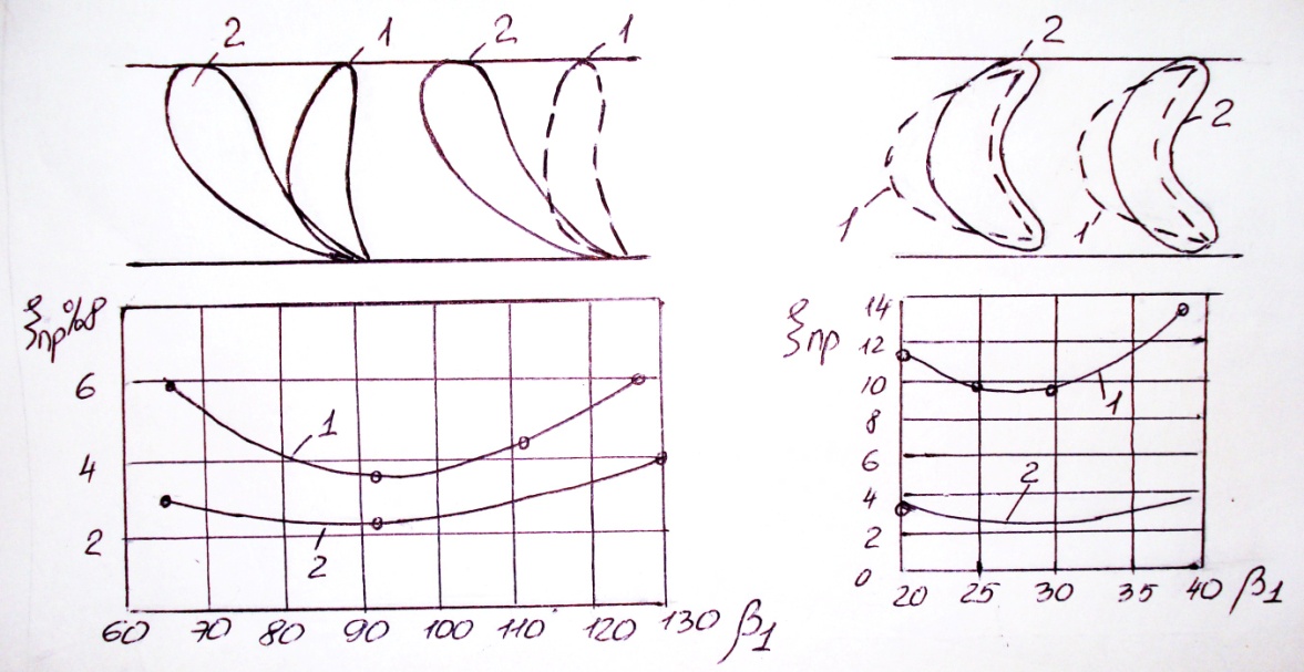 В активных лопатках с некоторой степенью реактивности потери при уменьшении β будут тем выше, чем меньше начальная степень реактивности на расчетном режиме.