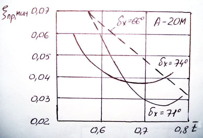 Оптимальное значение относительного шага получается тем меньше, чем больше по абсолютной величине угол атаки. Чем болше угол атаки, тем резче выражен минимум потерь (т.е. тем меньше выбор величины относительного шага). При отрицательных углах атаки в области больших значений относительного шага потери энергии меньше.