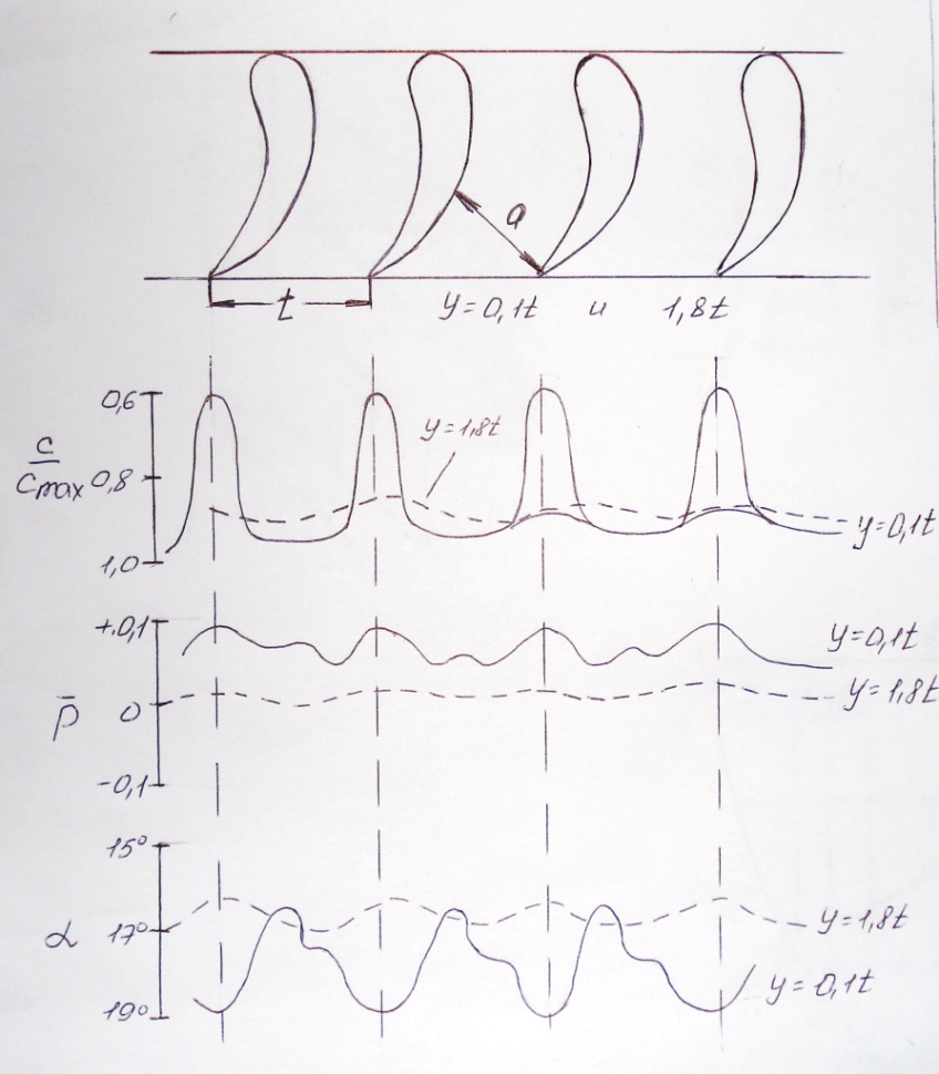 За выходной кромкой решетки в результате отрыва потока возникают вихри, образующие кромочный след. По опытным данным выравнивание потока за решеткой происходит достаточно интенсивно и практически заканчивается на расстоянии y = (1,3÷1,9)t от выходных кромок. На выравнивание потока затрачивается определенная энергия. На малых расстояниях за выходными кромками поток имеет неравномерные поля скоростей, давлений и углов.