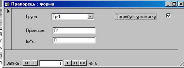 Допустимо що у таблиці даних про студентів є поле логічного типу, де вказується чи потрібне даному студенту місце у гуртожитку. Створюється форма у якій, крім різноманітних даних про студента, буде вказано чи потребує він гуртожитку у вигляді прапорця з відповідною відміткою (якщо він потребує гуртожитку) або без неї якщо потреби у гуртожитку немає.