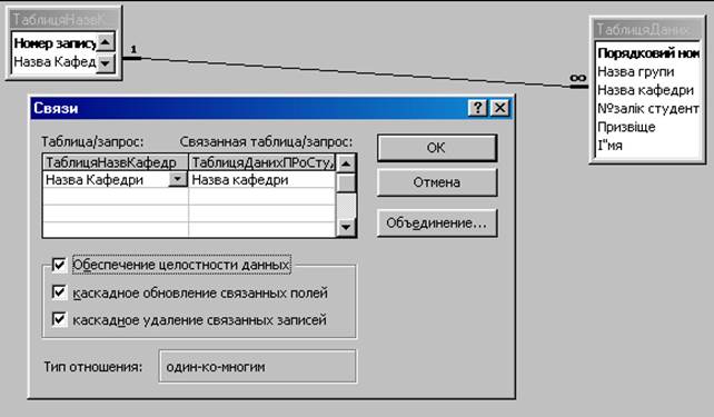 Наприклад як показано на рис.5, головна таблиця містить поле із назвами кафедр (які не можуть повторюватись) а зв’язана таблиця даних про студентів теж містить поле назв кафедр на яких вони навчаються.