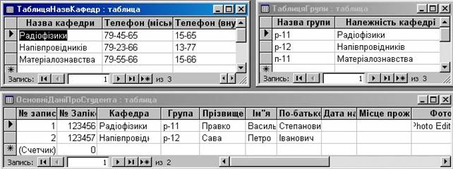 Покажемо проблеми, які виникають у цьому випадку на конкретному прикладі. Ми БД з трьох таблиць (рис.7): “ТаблицяНазвКафедр”, “ТаблицяГрупи”, “ОсновніДаніПроСтудента” котрі містять дані про студентів, групи та кафедри до яких вони належать. Встановлення зв’язків між таблицями по полях назв кафедр та назвах груп значно полегшить нам роботу при роботі з БД. При заповненні таблиць “ТаблицяГрупи” та “ОсновніДаніПроСтудента” можна значно полегшити ввід даних використавши майстер підстановок, при встановленні властивостей полів “Належність кафедрі” та “Кафедра”, використавши, як джерело, поле “Назва кафедри” таблиці “ТаблицяНазвКафедр”.
