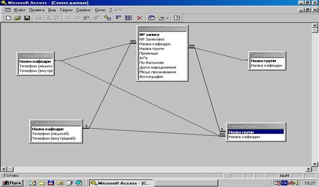 2. Встановити зв’язки типу Один-До-Багатьох між полями “Назва кафедри” (таблиця “ТаблицяНазвКафедр”) та “Належність кафедрі” (таблиця “ТаблицяГрупи”) і “Кафедра” (таблиця “ОсновніДаніПроСтудента”).