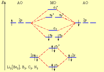 B ряду более легких элементов от Li2 до N2 последовательность заселения МО другая: