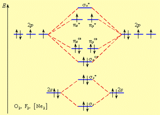 Из рис.8Б видно, что порядок связи в молекуле кислорода равен двум, так как на шесть связывающих электронов, приходится два неспаренных электрона на разрыхляющих орбиталях: ПС = (6 – 2)/ 2 = 2.