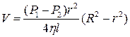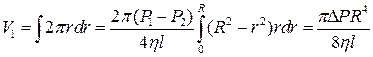 Визначимо тепер об’єм рідини, яка протікає через трубу за одиницю часу. Для цього розіб’ємо поперечний переріз труби на кільця товщиною dr з радіусом r. Тоді dV=2pvrdr. Після інтегрування