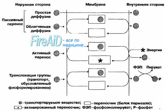 2. Поддержание осмотического давления, оптимального для протекания биохимических реакций. Поступление различных веществ внутрь бактериальной клетки реализуют три механизма: пассивный перенос, активный перенос и транспорт, обусловленный фосфорилированисм (рис. 4-6).