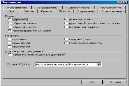 • Фоновая печать — возможность продолжения работы в Word во время печати документа. Можно задать объект печати: