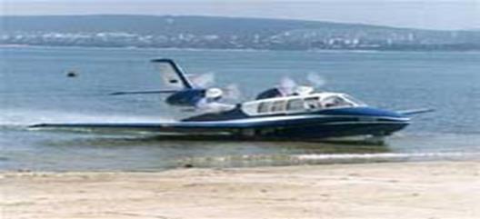The aircraft is a low-wing monoplane featuring +-type tail unit consisting of vertical fin with rudder and horizontal allmoving stabiliser, and tricycle landing gear with nose wheel. The power plant includes two TCM IO-360 piston engines mounted on horizontal pylons on either side of the fuselage. The low wing creates a considerable aerofoil effect at takeoff and landing, thus ensuring a three-point skimming capability (planning step, starboard and portside centre wing trailing edges).