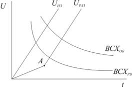 4.12. На тупиковой подстанции разрядник РВ установлен до защищаемого оборудования. Положение точки А перегиба кривой изменения напряжения на разряднике (рисунок) определяется?