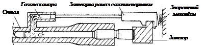 При пострілі (рис. 4.2) частина порохових газів, що рухаються за кулею, спрямовується крізь отвір у стінці каналу ствола у газову камору, тисне на передню стінку газового поршня і відкидає його разом із затворною рамою у заднє положення. При відході затворної рами назад відбувається відмикання затвора, який вилучає з патронника гільзу та викидає її назовні. Затворна рама стискає пружину зворотного механізму та зводить курок.