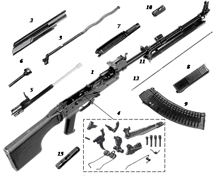 Автомат та кулемет складаються з 11 основних частин і механізмів,