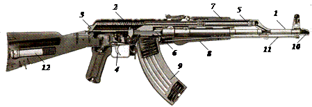 2 – кришка ствольної коробки; 3 – зворотний механізм; 4 – частини ударно-спускового механізму (розташованого у ствольній коробці); 5 – затворна рама з газовим поршнем; 6 – затвор; 7 – газова трубка зі ствольною накладкою; 8 – цівка; 9 – магазин; 10 – дуловий гальмо-компенсатор;