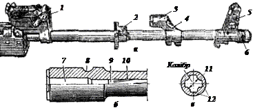 10 – запобіжник мушки; 11 – фіксатор; 12 – різьба для дулового гальма-компенсатора;