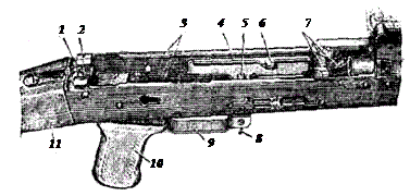 9 – спускова скоба; 10 – пістолетна рукоятка; 11 – приклад
