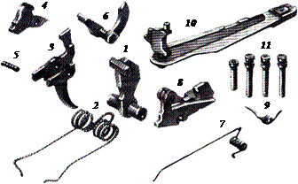 8 – уповільнювач курка; 9 – пружина уповільнювача курка; 10 – перевідник; 11 – осі