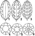1 — перисто-лопастной; 2 — перисто-раздельный; 3 — перисто-рассеченный; 4 — пальчато-лопастной; 5 — пальчато-раздельный; 6 — пальчато-рассеченный.