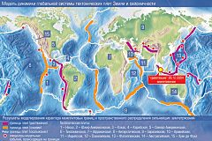 Данная модель основывается на анализе возможных сценариев взаимодействия главных тектонических плит: ученые определенным образом задают направление их движения и смотрят, где должны возникать землетрясения в силу накопления тектонических напряжений. Александр Соловьев: "Обозначенные на этой карте черными кружочками точки - те самые сильные землетрясения, которые были получены в данной модели (к слову, отмеченные на карте точки - это как минимум 'девятки'). И можно увидеть, что в районе Суматры такой кружочек нарисовался, ну не совсем прямо в той самой точке, где произошло декабрьское землетрясение, но очень близко. К сожалению, связать то, что получается в теоретической модели, с реальным временем, то есть предсказать хотя бы примерный временной диапазон возможного землетрясения исходя из ее результатов, мы пока не можем - такое событие может в принципе случиться и через год, и через десять лет".Цепь землетрясений