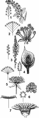 1 — кисть; 2 — щиток; 3 — колос; 4 — початок; 5 — зонтик; 6 — головка; 7 — корзинка.