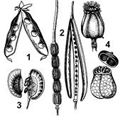 1 — боб; 2 — стручок; 3 — стручочек; 4 — коробочка.