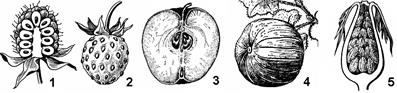 1 — сборная костянка; 2 — земляничина; 3 — яблоко; 4 — тыквина; 5 — цинародий.