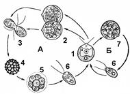 А — половое размножение (1 — материнское растение; 2 — образование гамет; 3 — копуляция гамет; 4 — зигота; 5 — прорастание зиготы; 6 — зооспора); Б — бесполое размножение (7 — образование зооспор).