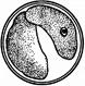ных органическими веществами (рис. 60). Клетка хламидомонады имеет округлую или овальную форму, передний конец заострен в виде носика. На нем располагаются два одинаковой величины жгутика, с помощью которых хламидомонада передвигается в воде. Оболочка клетки пектиново-целлюлозная. В центре клетки располагается чашевидный хроматофор с