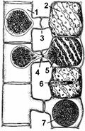 1 — слизистый покров; 2 — клеточная стенка; 3 — ядро; 4 — цитоплазма; 5 — пиреноид; 6 — хроматофоры.