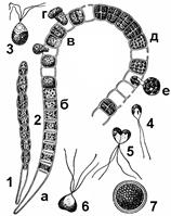 1 — молодая нить; 2 — взрослая нить (а — ризоидальная клетка; б — вегетативная клетка; в — начало спорообразования; г — выход зооспор; д — образование гамет; е — выход гамет); 3 — зооспора; 4 — гамета; 5-6 — копуляция гамет; 7 — зигота.