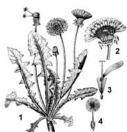 1 — общий вид растения; 2 — соцветие в разрезе; 3 — язычковый цветок; 4 — плод.