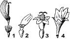 1 — простой околоцветник; 2 — пестик; 3 — шесть тычинок; 4 — луковица.