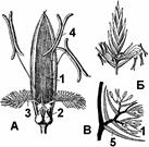 А — строение цветка овсяницы; Б — колосок овсяницы; В — схема строения трехцветкового колоска (1 — цветочная чешуя; 2 — цветочные пленки; 3 — гинецей; 4 — андроцей; 5 — колосковая чешуя).