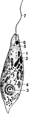 1 — пелликула; 2 — запасные питательные вещества; 3 — ядро; 4 — хроматофоры; 5 — сократительная вакуоль; 6 — стигма; 7 — жгутик.