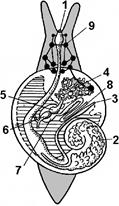 1 — рот, 2 — печень, 3 — анальное отверстие, 4 — капиллярная сеть легкого, 5 — предсердие, 6 — желудочек, 7 — перикардий, 8 — отверстие почки.