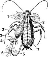 1 — слюнные железы; 2 — пищевод и зоб; 3 — желудок; 4 — слепые выросты средней кишки; 5 — задняя кишка; 6 — мальпигиевы сосуды; 7 — яичник; 8 — брюшная нервная цепочка.