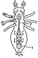 1 — сердце, 2 — аорта. Стрелки показывают направление тока гемолимфы.