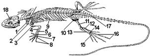 1 — ключица; 2 — лопатка; 3 — плечевая кость; 4 — лучевая кость; 5 — локтевая кость; 6 — запястье; 7 — пясть; 8 — фаланги пальцев; 9 — ребра; 10 — таз; 11 — бедренная кость; 12 — большая берцовая кость; 13 — малая берцовая кость; 14 — предплюсна; 15 — плюсна; 16 — фаланги пальцев; 17 — позвоночник; 18 — череп.