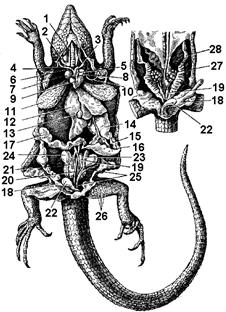 1,2 — яремные вены; 3,4 — сонные артерии; 5 — левая дуга аорты; 6 — правя дуга аорты; 7 — правое предсердие; 8 — левое предсердие; 9 — желудочек; 10 — подключичная артерия; 11 — легкое; 12 — печень; 13 — желчный пузырь; 14 — желудок; 15 — поджелудочная железа; 16 — двенадцатиперстная кишка; 17 — толстая кишка; 18 — прямая кишка; 19 — почка; 20 — спинная аорта; 21 — выносящие вены почек; 22 — мочевой пузырь; 23 — придаток семенника; 24 — семенник; 25 — семяпровод; 26 — бедренные поры; 27 — яичник; 28 — яйцевод.