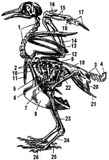 1 — шейные позвонки; 2 — грудные позвонки; 3 — хвостовые позвонки; 4 — копчиковая кость; 5, 6 — ребра; 7 — грудина; 8 — киль грудины; 9 — лопатка; 10 — коракоид (воронья кость); 11 — ключица (вилочка); 12 — плечевая кость; 13 — лучевая кость; 14 — локтевая кость; 15 — пясть; 16—18 — фаланги пальцев; 19—21 — тазовые кости; 22 — бедренная кость; 23 — кость голени; 24 — цевка; 25, 26 — фаланги пальцев.
