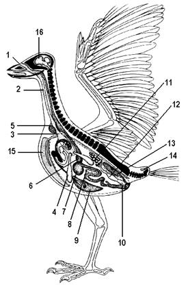 1 — носовые отверстия (ноздри); 2 — трахея; 3 — легкое; 4 — воздушные мешки; 5 — зоб; 6 — железистый желудок; 7 — мускульный желудок; 8 — поджелудочная железа; 9 — печень; 10 — клоака; 11 — яичник; 12 — мюллеров канал (яйцевод); 13 — почка; 14 — копчиковая железа; 15 — киль грудины; 16 — головной мозг, большие полушария.
