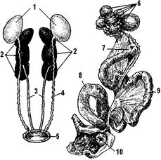 1 — семенники; 2 — почечные доли; 3 — мочеточники; 4 — семяпроводы; 5 — клоака; 6 — граафовы пузырьки; 7 — воронка яйцевода; 8 — матка; 9 — часть яйцевода, выделяющая белок; 10 — отверстие кишки.