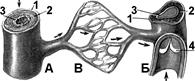 Рис. 197. Строение кровеносных сосудов (А — артерий, Б — вен, В — капилляров):